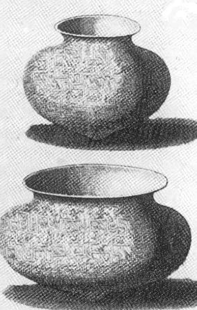 Il s'agissait de récipients appelés canaris. A la Martinique on dit encoe : "ce sont les vieux canaris qui font les bonnes soupes ! | La couleuvre représentée ici mesurait environ 6 pieds de long : c'était une sorte de bas tressé qui avec une pierre au bout permettait d'extraire le jus du manioc amer (camanioc) |