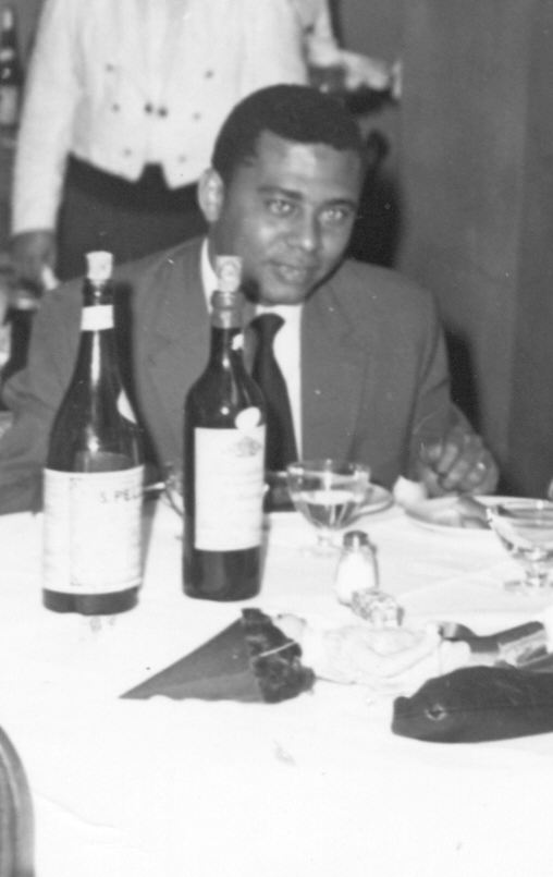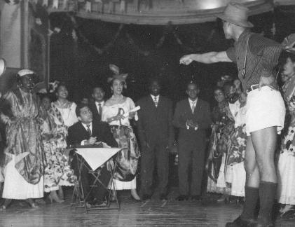 Mais après les efforts il y avait des réconforts : voici Marc, dans le cadre du GRAND HÔTEL, lors du GRAND BAL ANNUEL DES ETUDIANTS ANTILLAIS, jouant le rôle d'un juge arrogant, en costume-cravate, mis en boite par un personnage extravagant et rigolard du folklore antillais... Après le spectacle Marc trinquera avec deux de ses amis martiniquais et étudiants hispanisants Edouard JEAN-ELIE et Xavier ORVILLE !