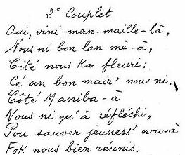 Case-Pilote, Case-Pilote Ou sé an le tit bourg, Ou très intéressant mais ou pas mêm save ça. Nous ni bons poissons frais, Belles moune pou les amours Et nous pas trop loin la ville, Fok nous penser à ça... |